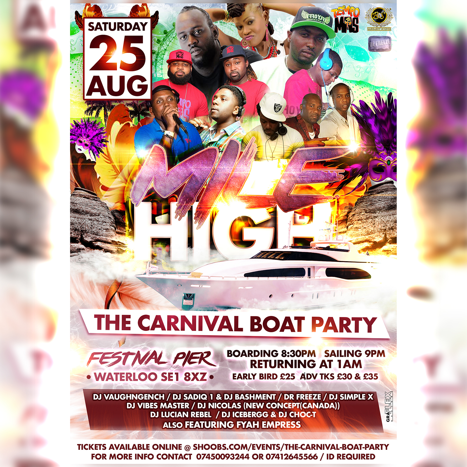 MILE HIGH The Carnival Boat⛴Party🎉 Sat 25th August Festival pier Southbank Waterloo SE1 8XZ Boarding 8:30pm Sharp Sailing 9pm Returning 1am Featuring live from 🇻🇨🇹🇹 Soca Artiste🔥Fyah...